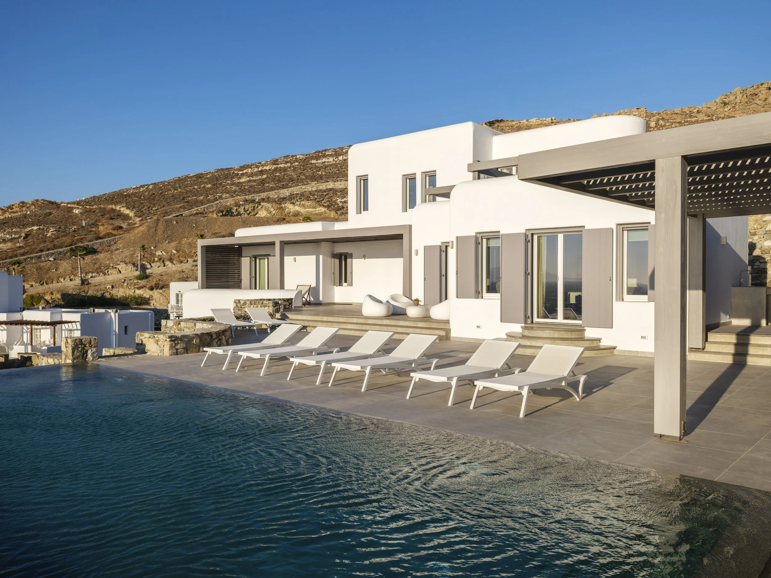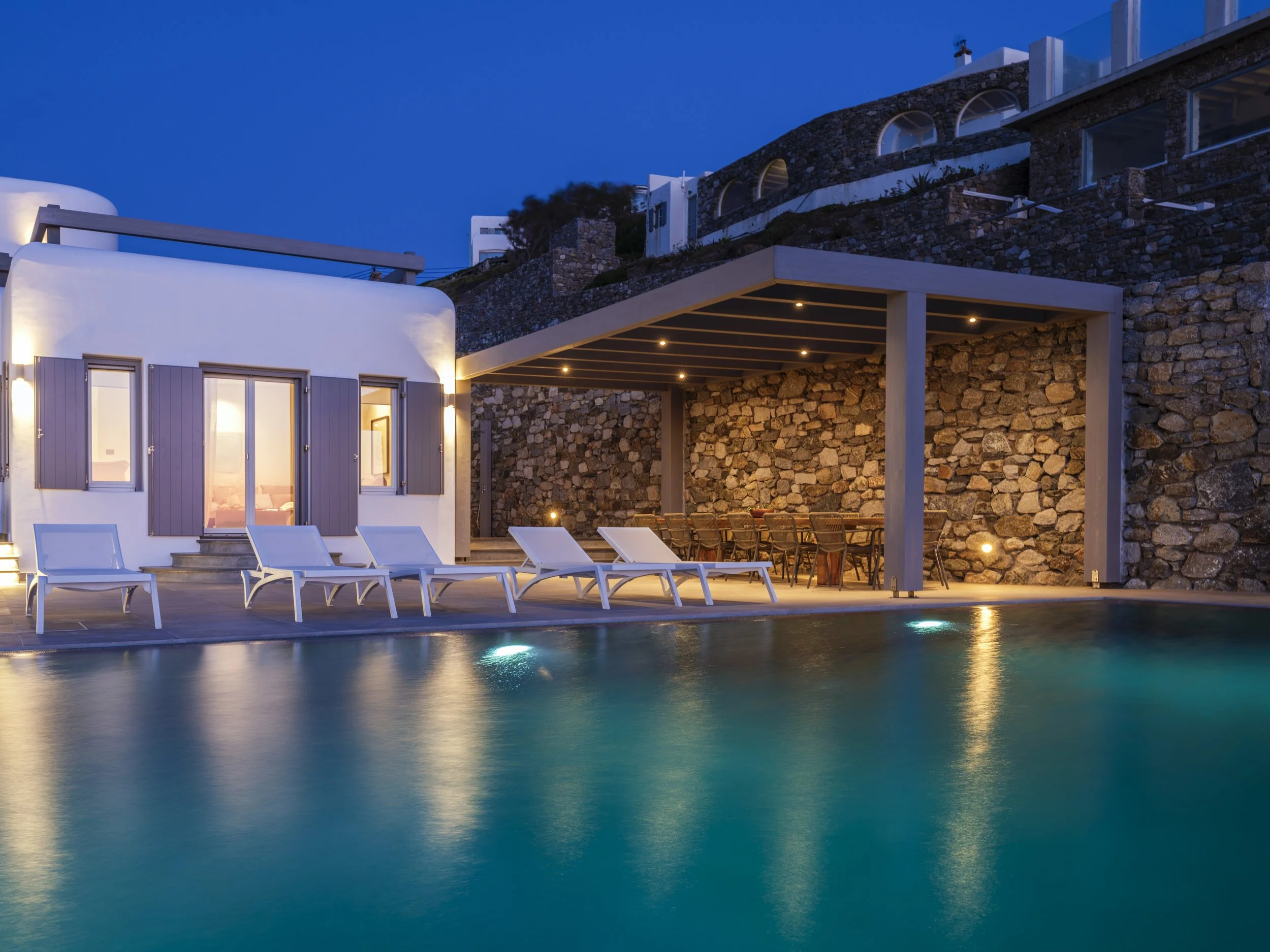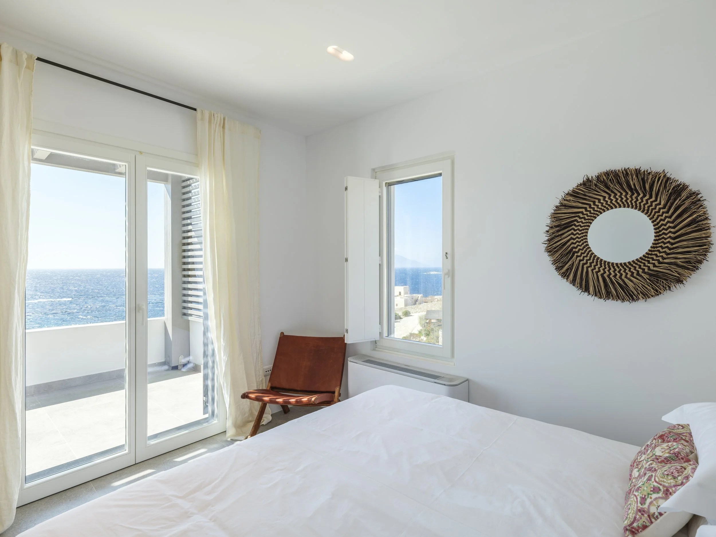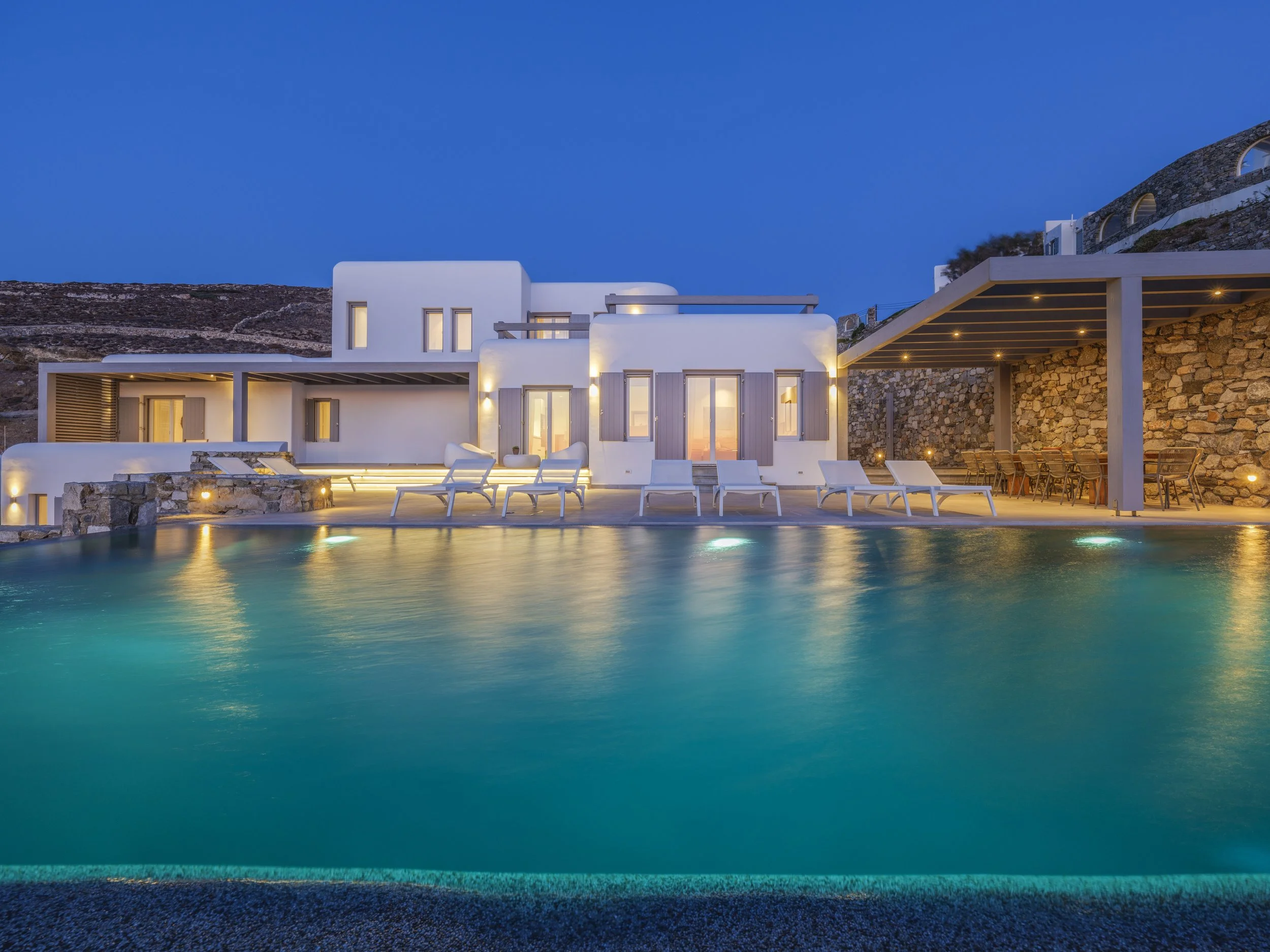 Located at Pouli, this newly constructed two-story villa (300m2, guest room with kitchenette 70m2 at an extra cost) offers unobstructed sea views, complete seclusion, and close access to Mykonos town. It gazes across the Aegean waters towards the islands of Tinos, Rhinia, and Delos enjoying amazing energizing sunsets and provides direct access to a private beach.