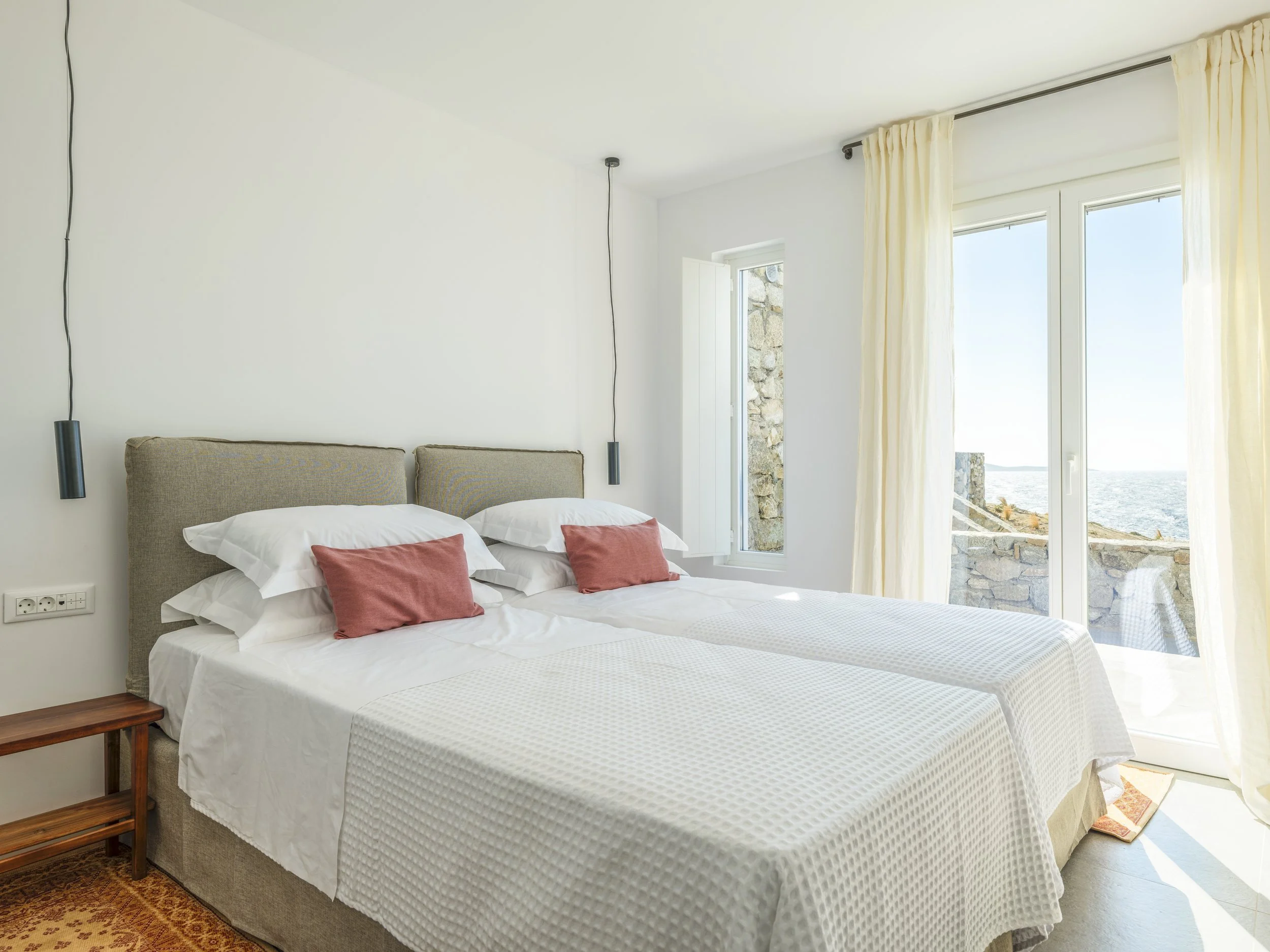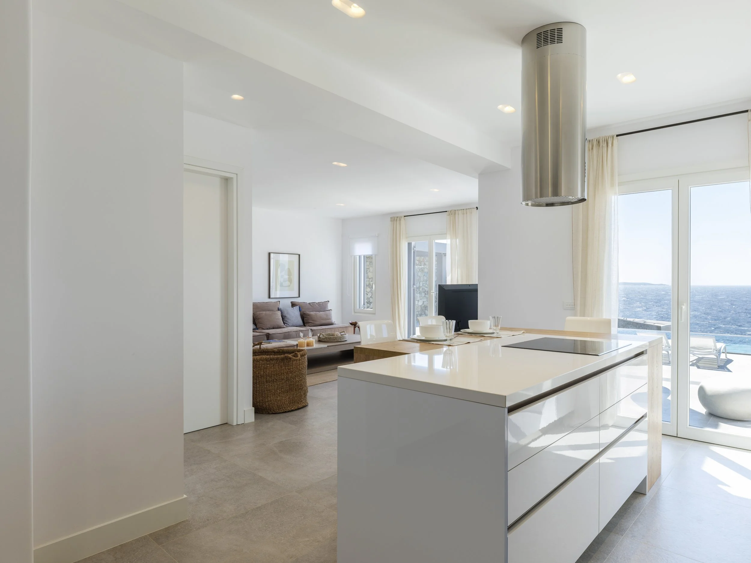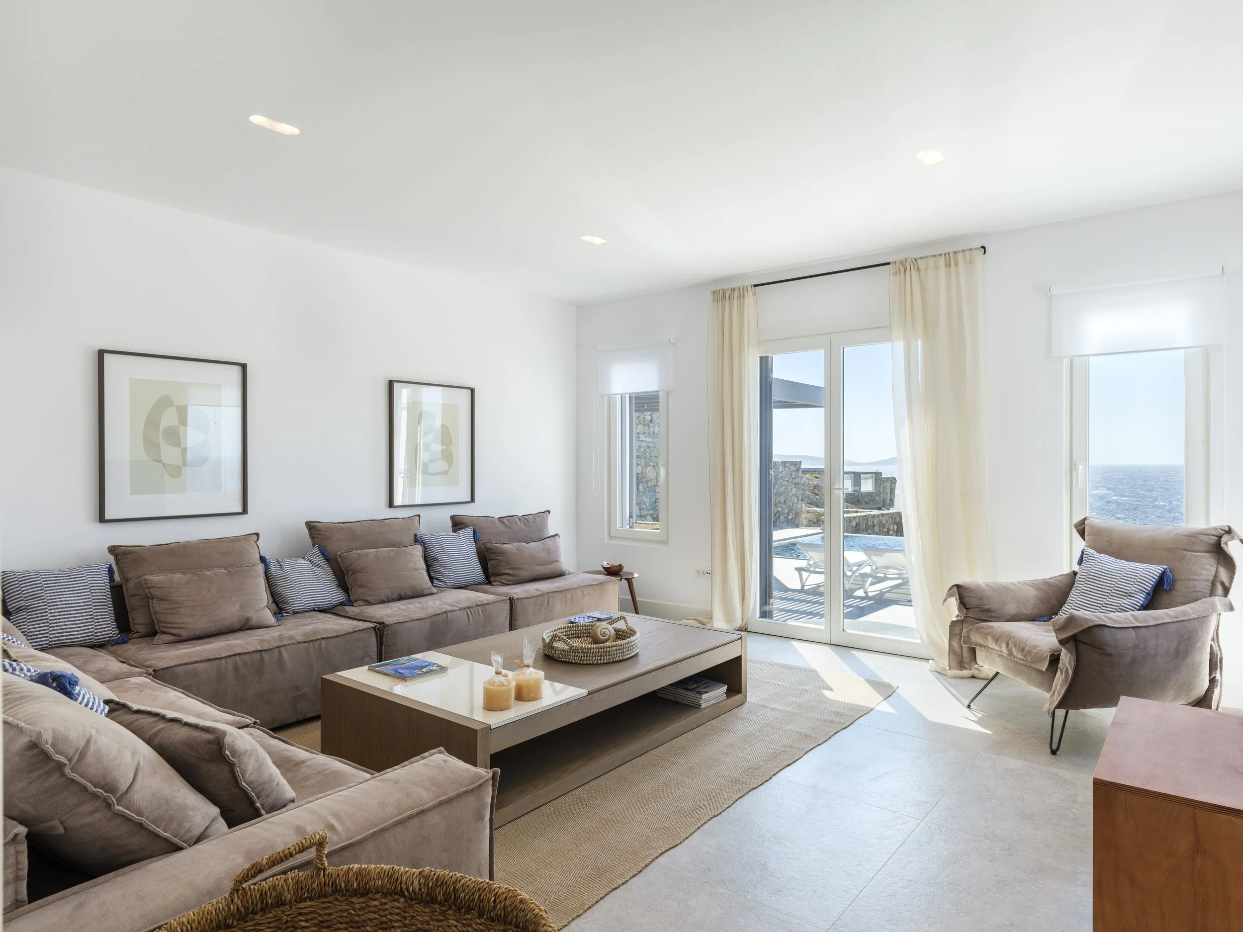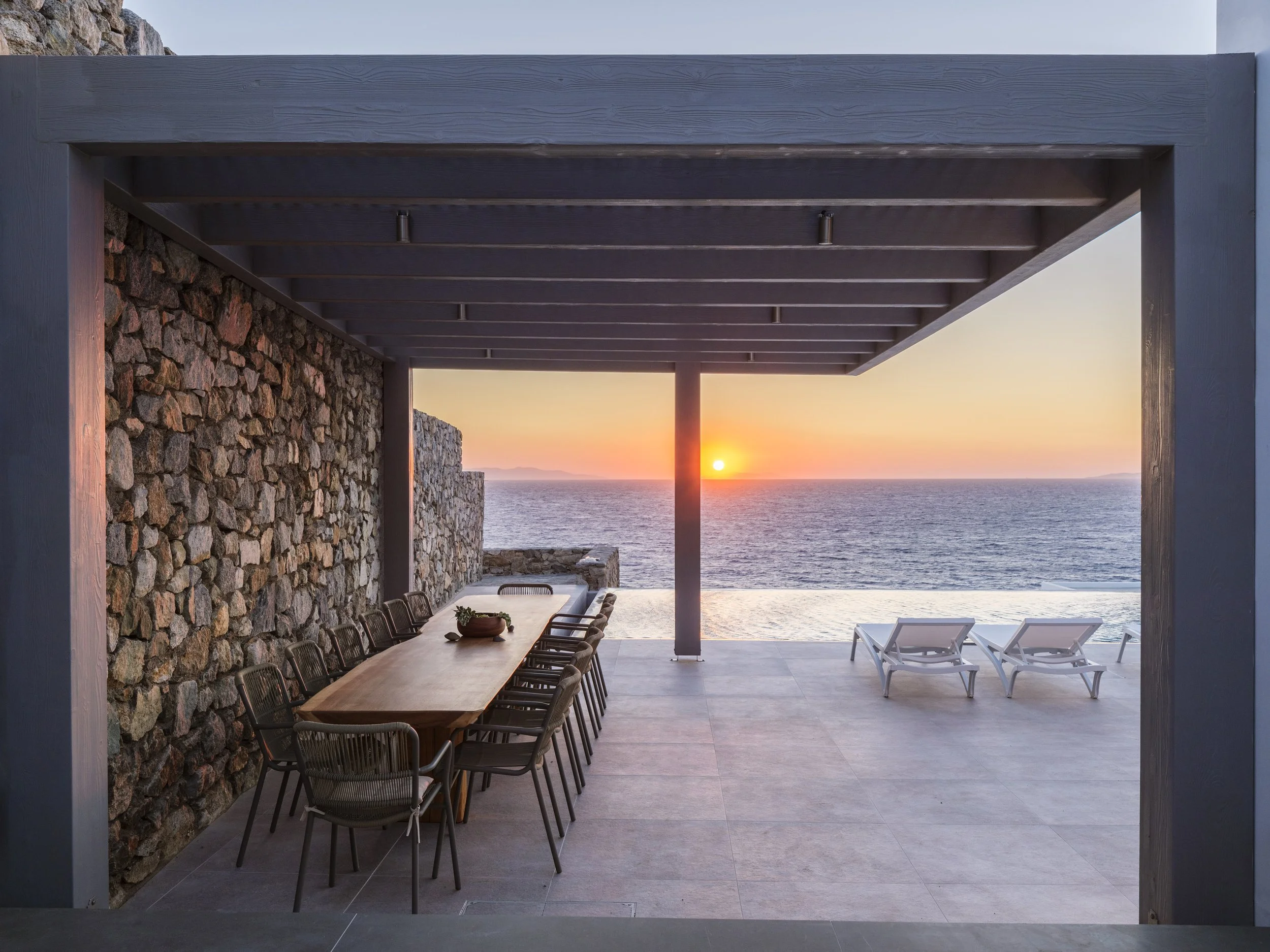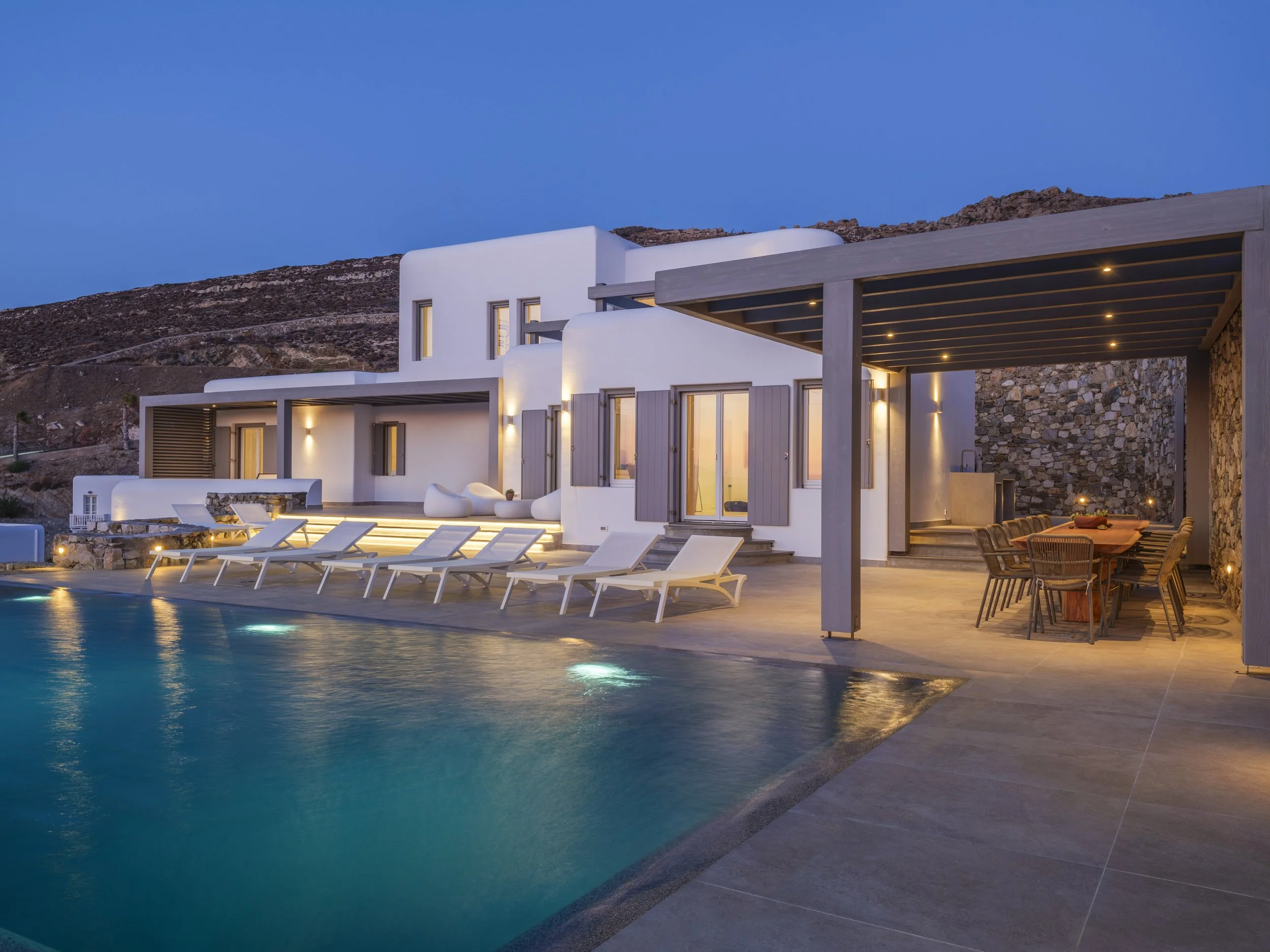 Located at Pouli, this newly constructed two-story villa (300m2, guest room with kitchenette 70m2 at an extra cost) offers unobstructed sea views, complete seclusion, and close access to Mykonos town. It gazes across the Aegean waters towards the islands of Tinos, Rhinia, and Delos enjoying amazing energizing sunsets and provides direct access to a private beach.